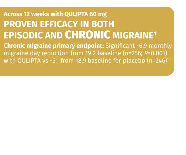 QULIPTA 60 mg: -3.6 MMD across 12 weeks (baseline MMD was 7.7) (n=177) (P=0.039).1