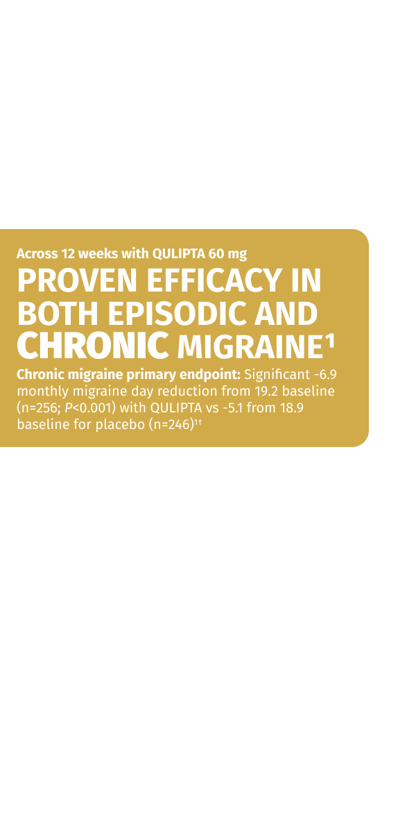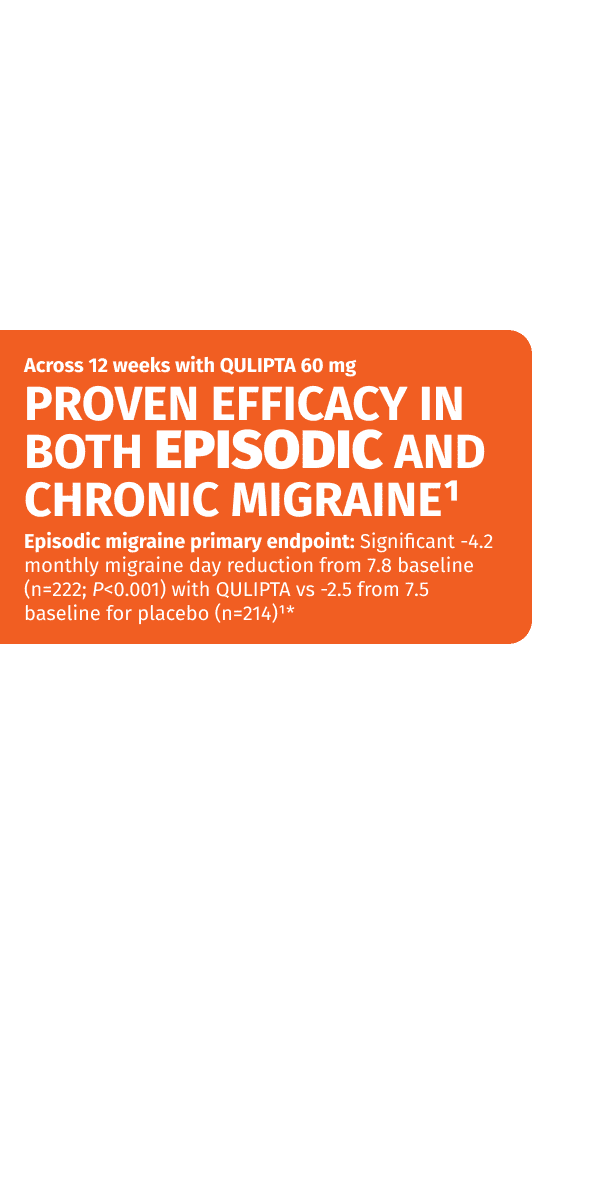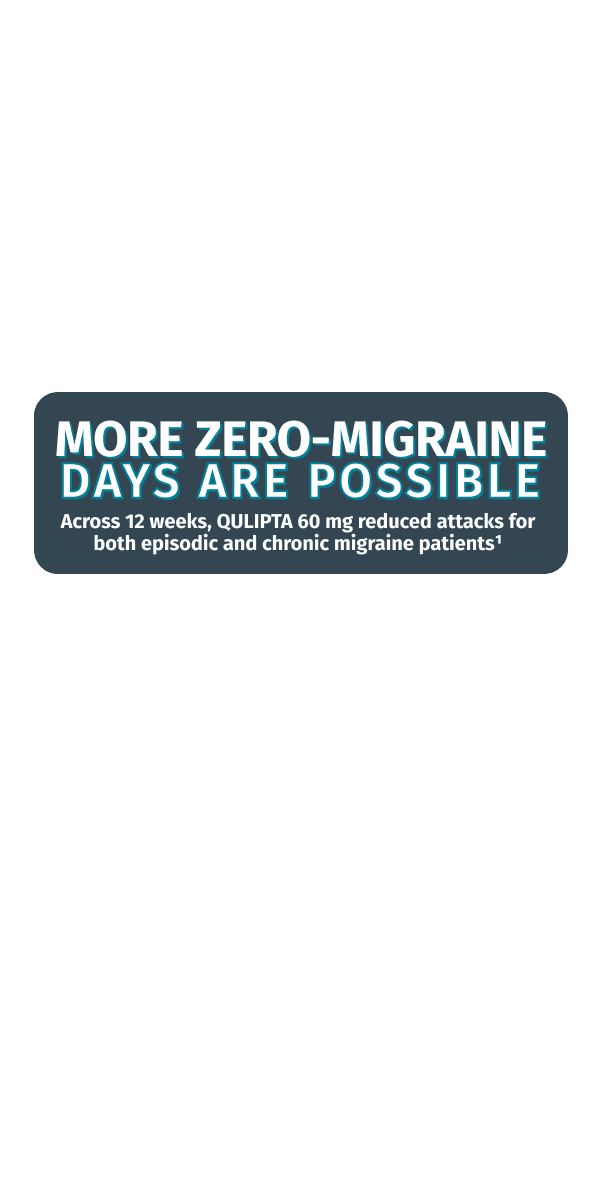References: 1. QULIPTA [package insert]. North Chicago, IL: AbbVie Inc.; 2025. 2. Protocol for: Ailani J, Lipton RB, Goadsby PJ, et al; ADVANCE Study Group. Atogepant for the preventive treatment of migraine. N Engl J Med. 2021;385(8):695-706. doi:10.1056/NEJMoa2035908