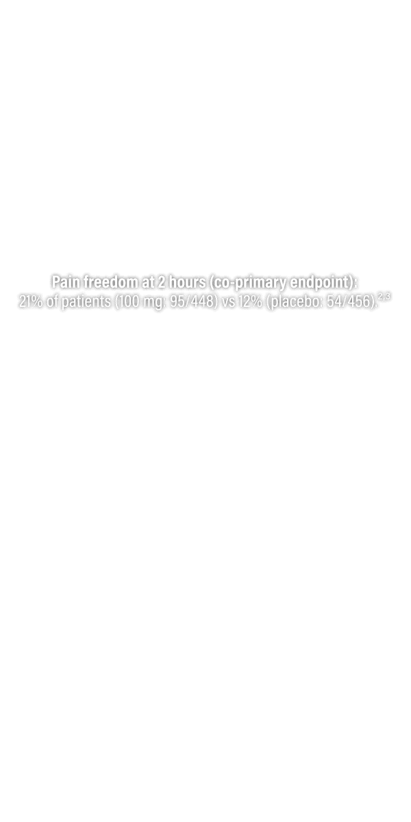 Similar results were seen at 2 hours postdose for patients taking UBRELVY 50 mg. 21% (182/886) of patients experienced pain freedom vs 13% placebo (119/912).6