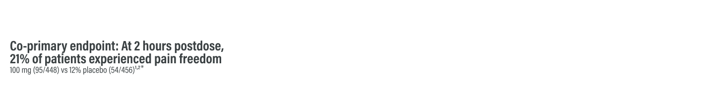 Similar results were seen at 2 hours postdose for patients taking UBRELVY 50 mg. 21% (182/886) of patients experienced pain freedom vs 13% placebo (119/912).5