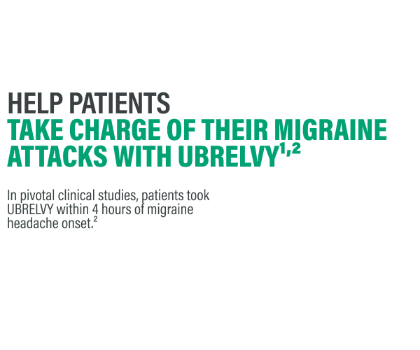References: 1. UBRELVY [package insert]. North Chicago, IL: AbbVie Inc.; 2025. 2. Data on file. AbbVie Inc. 3. Dodick DW, Lipton RB, Ailani J, et al. Ubrogepant, an acute treatment for migraine, improved patient-reported functional disability and satisfaction in 2 single-attack phase 3 randomized trials, ACHIEVE I and II. Headache. 2020;60(4):686-700. 4. Dodick DW, Lipton RB, Ailani J, et al. Ubrogepant for the treatment of migraine. N Engl J Med. 2019;381(23):2230-2241. 5. Hutchinson S, Dodick DW, Treppendahl C, et al. Ubrogepant for the acute treatment of migraine: pooled efficacy, safety, and tolerability from the ACHIEVE I and ACHIEVE II phase 3 randomized trials. Neurol Ther. 2021;10(1):235-249.