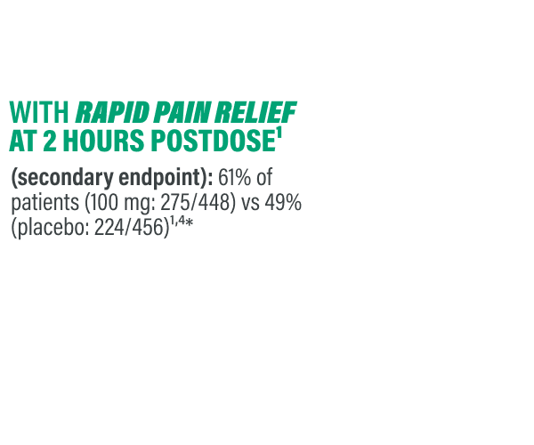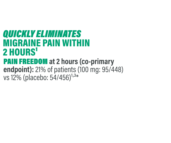 Similar results were seen at 2 hours postdose for patients taking UBRELVY 50 mg. 21% (182/886) of patients experienced pain freedom vs 13% placebo (119/912). 62% of patients (547/886) experienced pain relief vs 49% placebo (444/912).5