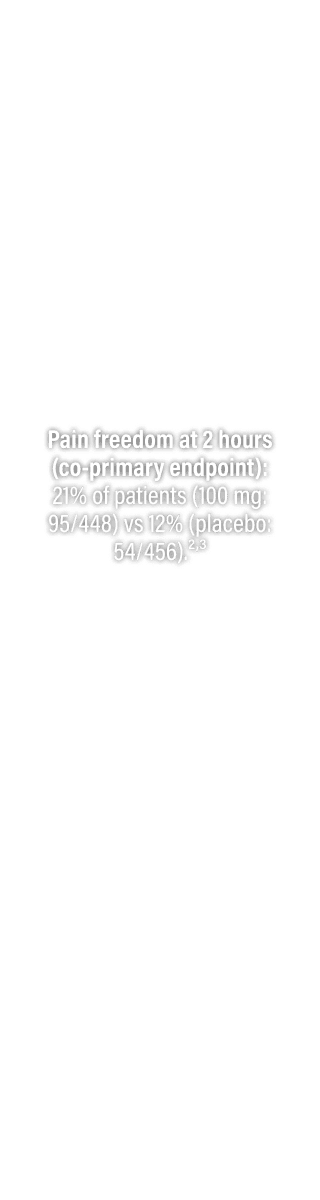 Similar results were seen at 2 hours postdose for patients taking UBRELVY 50 mg. 21% (182/886) of patients experienced pain freedom vs 13% placebo (119/912).4