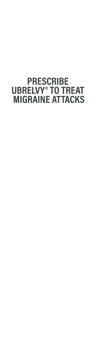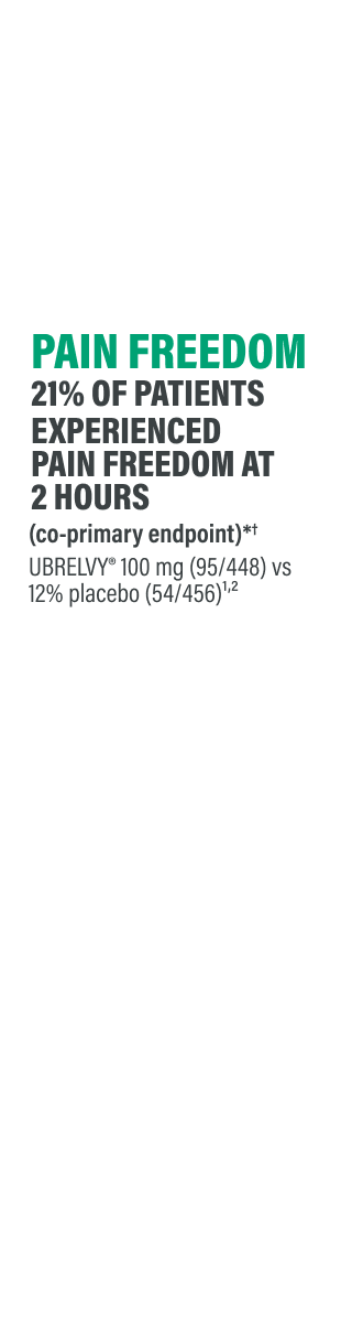 References: 1. UBRELVY [package insert]. North Chicago, IL: AbbVie Inc.; 2025. 2. Data on file. AbbVie Inc. 3. Dodick DW, Goadsby PJ, Schwedt TJ, et al. Ubrogepant for the treatment of migraine attacks during the prodrome: a phase 3, multicentre, randomised, double‑blind, placebo‑controlled, crossover trial in the USA. Lancet. 2023;402(10419):2307-2316. 4. Hutchinson S, Dodick DW, Treppendahl C, et al. Ubrogepant for the acute treatment of migraine: pooled efficacy, safety, and tolerability from the ACHIEVE I and ACHIEVE II phase 3 randomized trials. Neurol Ther. 2021;10(1):235-249. 5. Lipton RB, Dodick DW, Ailani J, et al. Effect of ubrogepant vs placebo on pain and the most bothersome associated symptom in the acute treatment of migraine: the ACHIEVE II randomized clinical trial. JAMA. 2019;322(19):1887-1898. 6. Dodick DW, Lipton RB, Ailani J, et al. Ubrogepant for the treatment of migraine. N Engl J Med. 2019;381(23):2230-2241. 7. Dodick DW, Lipton RB, Ailani J, et al. Ubrogepant, an acute treatment for migraine, improved patient‑reported functional disability and satisfaction in 2 single-attack phase 3 randomized trials, ACHIEVE I and II. Headache. 2020;60(4):686-700.