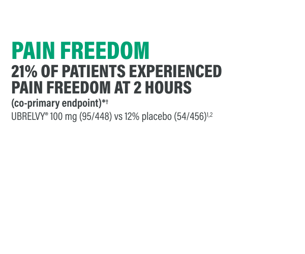 Similar results were seen at 2 hours postdose for patients taking UBRELVY 50 mg. 21% (182/886) of patients experienced pain freedom vs 13% placebo (119/912).4