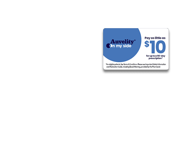 Patient Eligibility Requirements: This offer is valid only for patients 18 years of age or older with private health insurance coverage. Patient must have a valid prescription for Auvelity® (dextromethorphan HBr and bupropion HCl) extended-release tablets 45 mg/105 mg at the time the prescription is filled by the pharmacist and dispensed to the patient. Patient must have private health insurance that provides coverage for some portion of the cost of AUVELITY. Patient is a resident of the United States or U.S. territories based on patient's address.