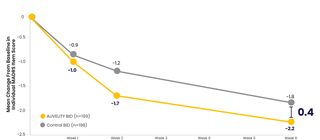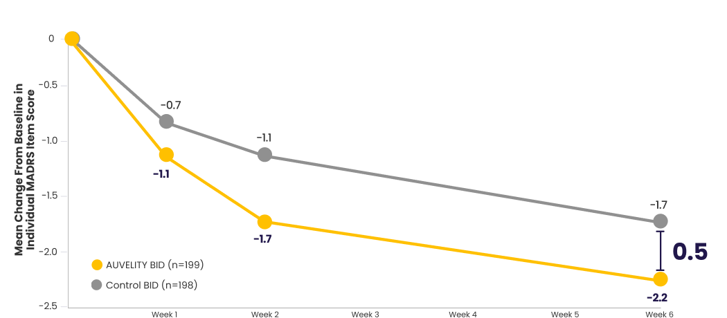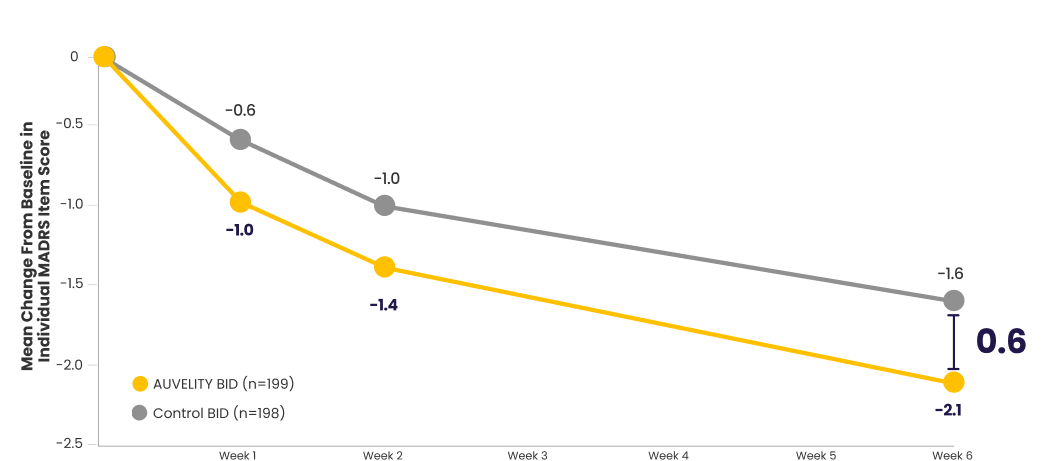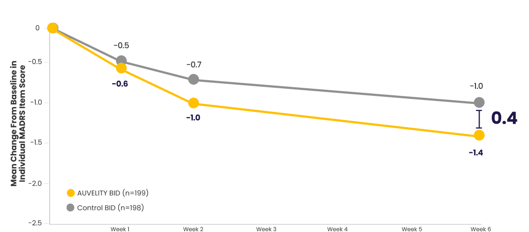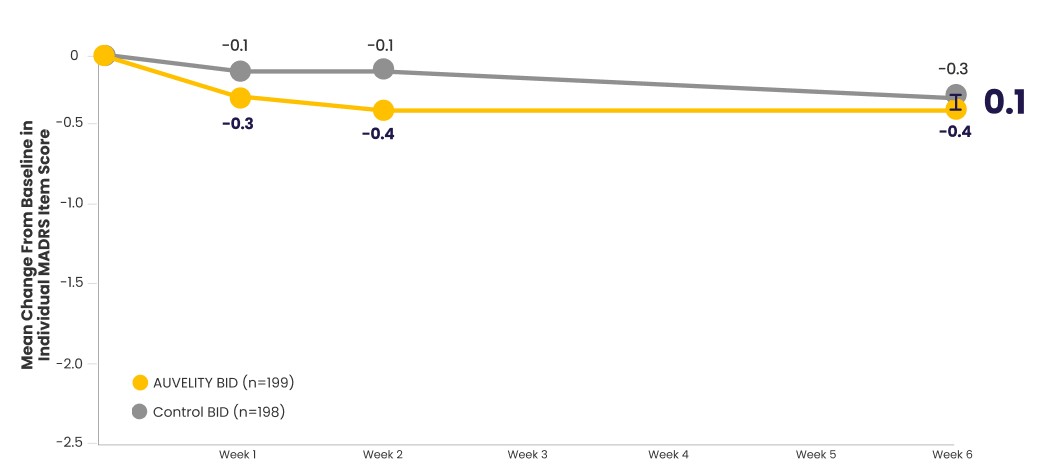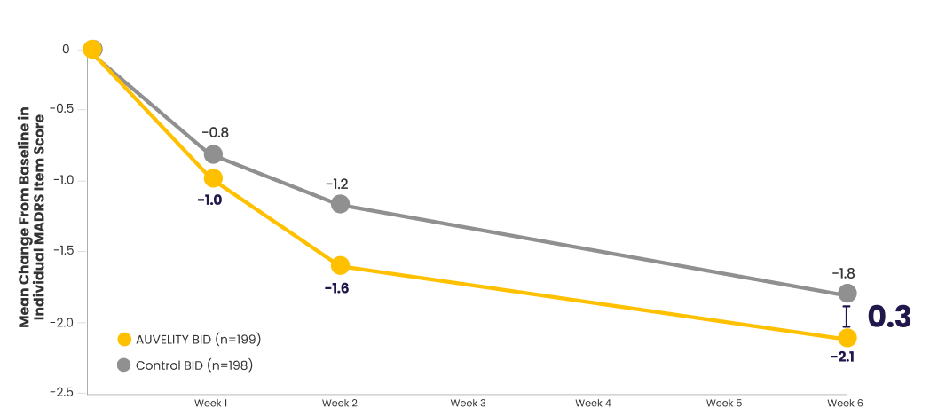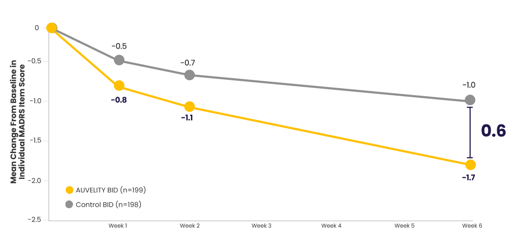 Scores for AUVELITY and the control group were rounded to the nearest tenth for presentation purposes. The difference between groups was calculated using the original, unrounded values.