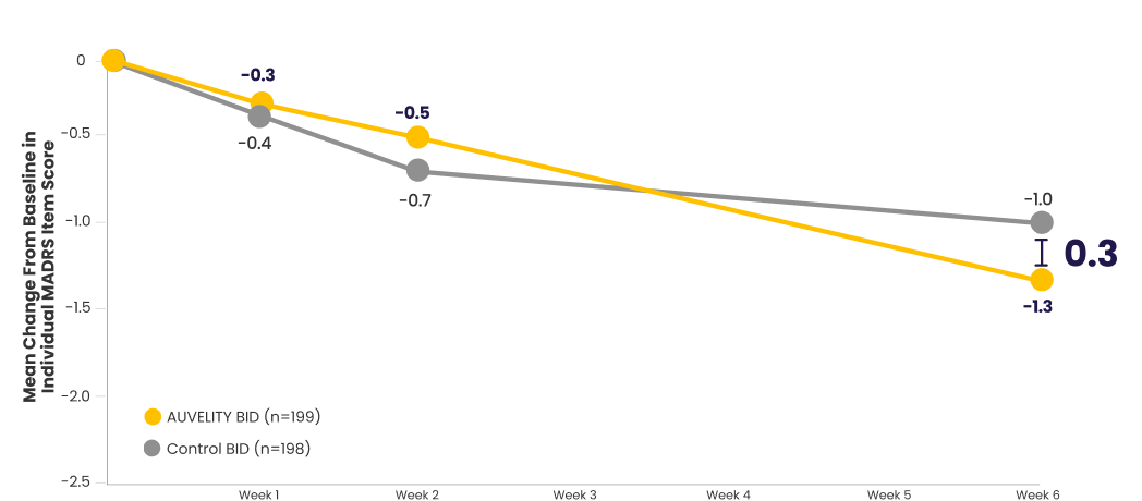 AUVELITY showed a numerical decrease across all item scores at Week 61,2*