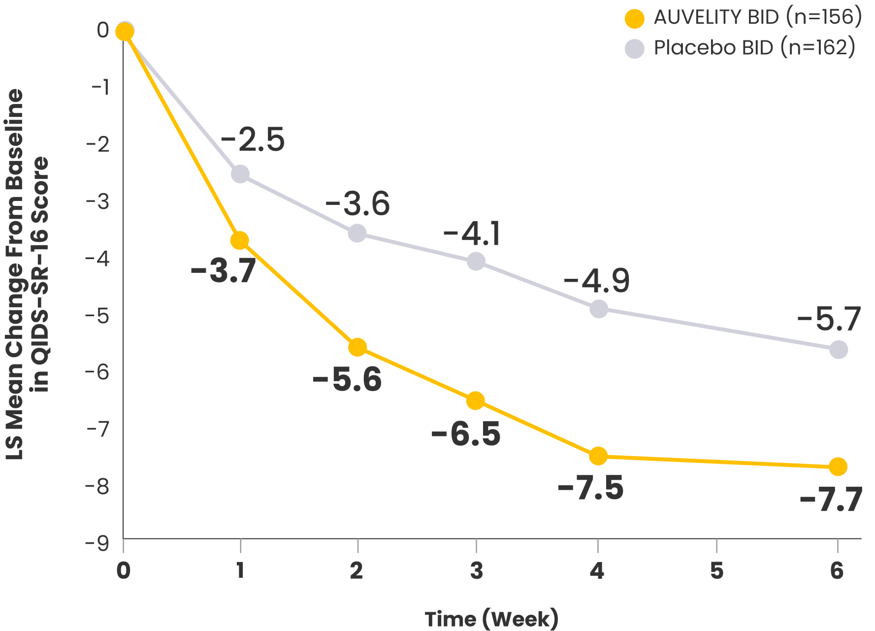 Change in QIDS-SR-16 score vs placebo1-3*