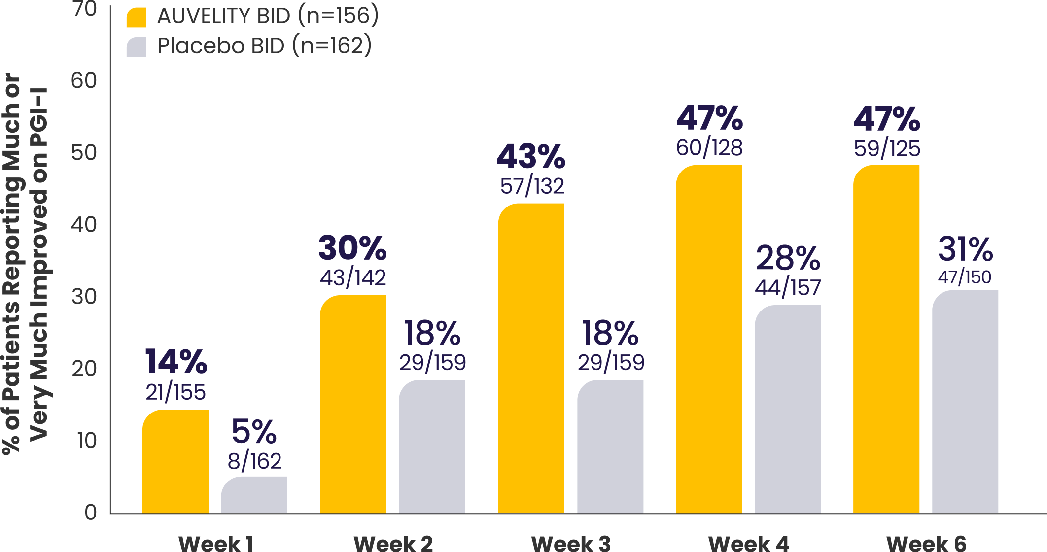 More patients reported being "very much improved" or "much improved" on the PGI-I scale from Week 1 through Week 61