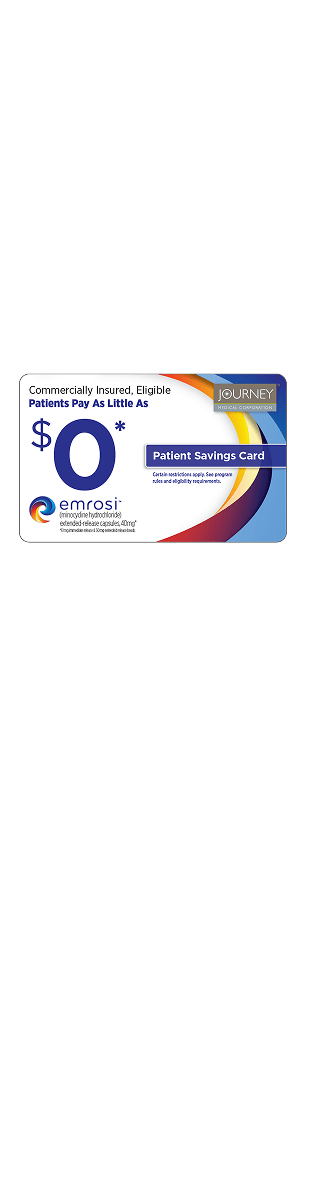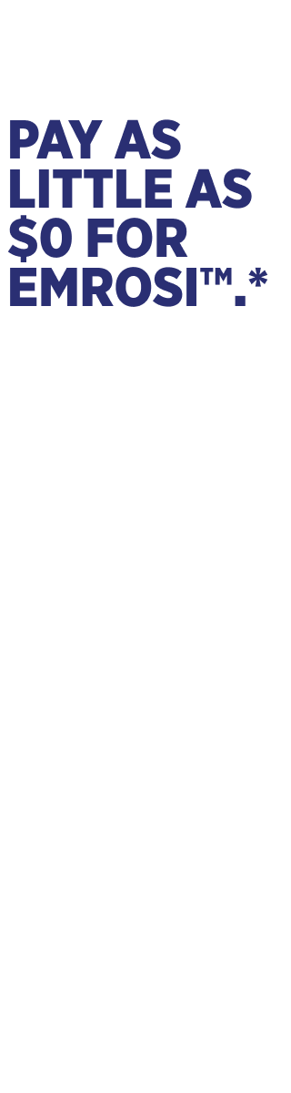 *Terms and conditions: This program offer is only good with a prescription of EMROSI™ and is valid for EMROSI™ (NDC 69489-131-30). This program offer is not valid for prescriptions reimbursed by Medicare, Medicaid, federal or state programs (including any state prescription drug programs). This program offer is valid only in the United States and cannot be redeemed at government subsidized pharmacies. Not valid with any other offer. Maximum reimbursement limits apply. Void where prohibited.