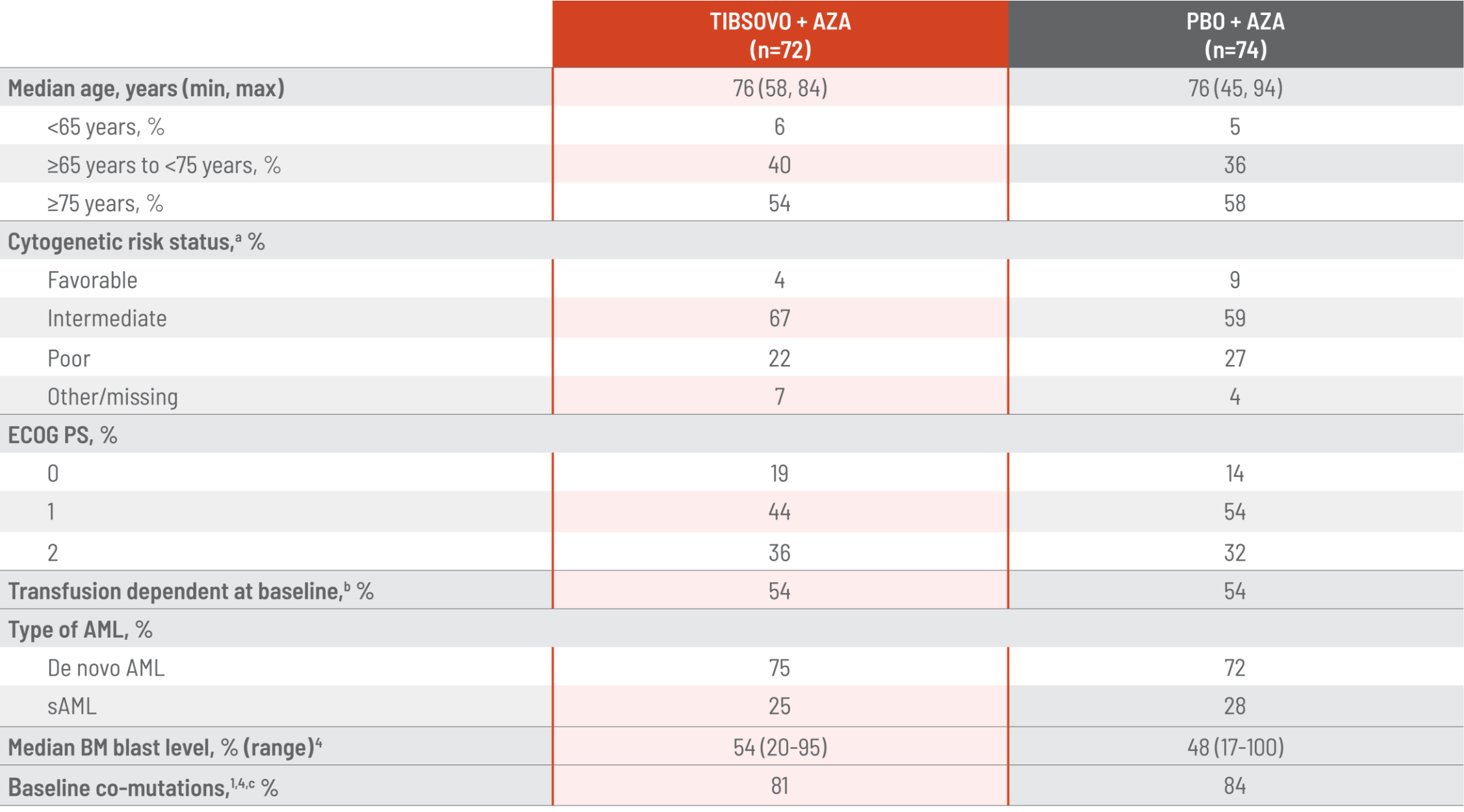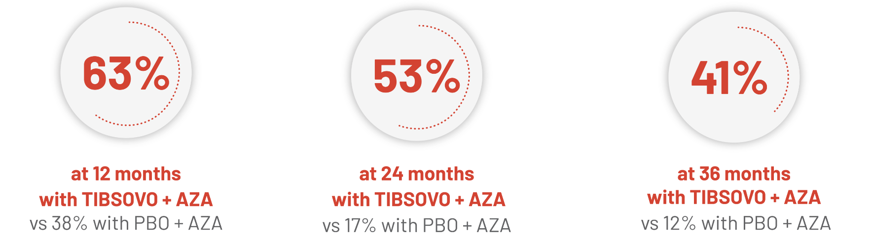 bIn the long-term follow-up analysis from the AGILE study, 148 patients were 1:1 randomized: 73 to TIBSOVO + AZA and 75 to PBO + AZA.2 The data cutoff was June 2022 with a median follow-up of 28.6 months for the OS analysis.