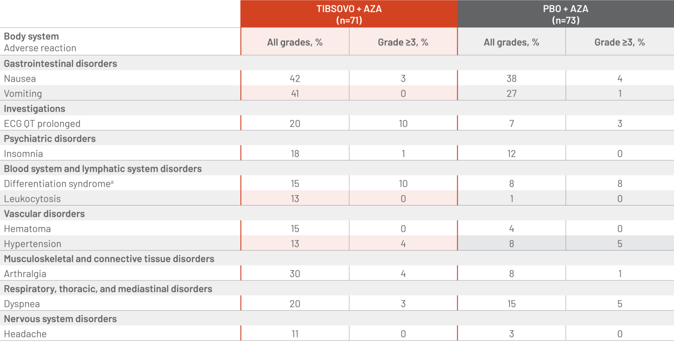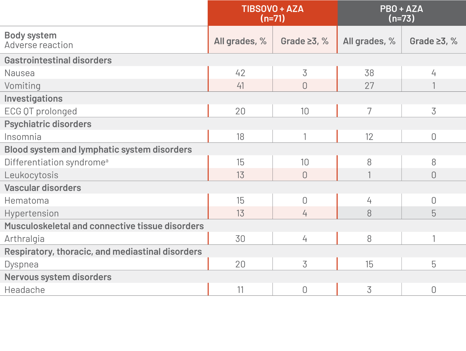 TIBSOVO + AZA was associated with a lower rate of infection of any grade compared with PBO + AZA (28% vs 49%)4