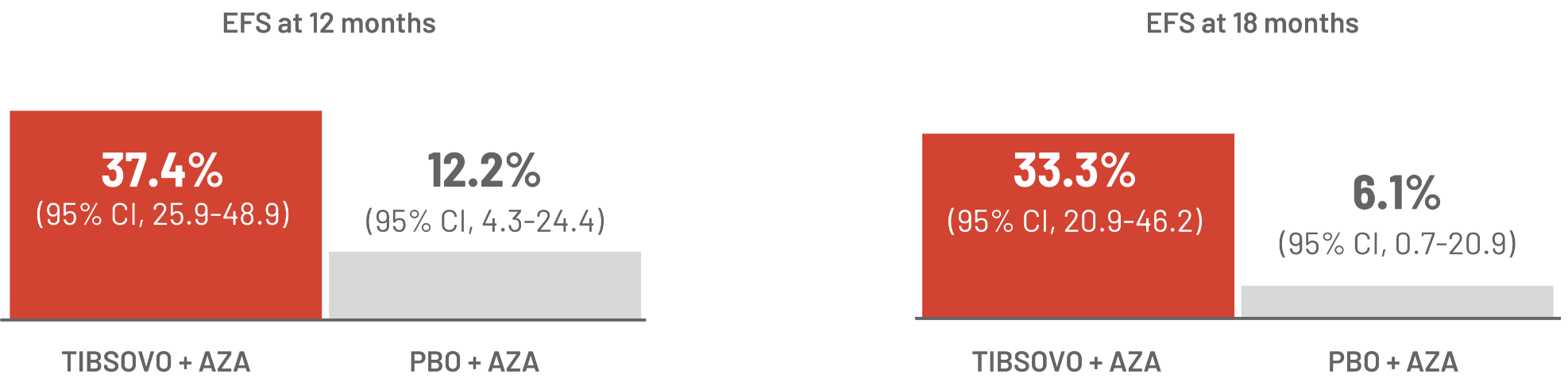 AZA, azacitidine; BM, bone marrow; CR, complete remission; EFS, event-free survival; HR, hazard ratio; IC, induction chemotherapy; mIDH1, mutated IDH1; PBO, placebo.