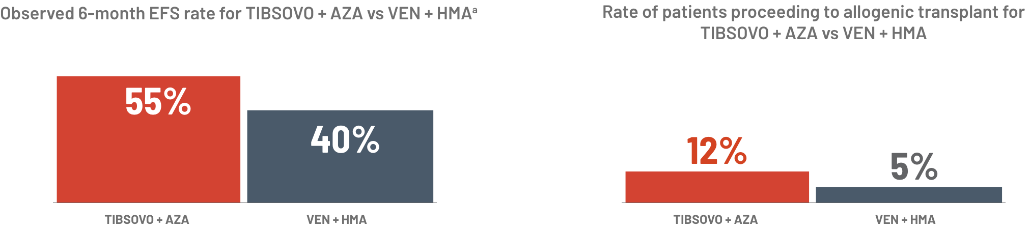 aThis retrospective subgroup analysis compares TIBSOVO + AZA (n=143) vs VEN + HMA (n=101).5 The TIBSOVO + AZA cohort is a subset of a larger patient population (n=182) that was previously presented.5,7 Treatment was delivered in both community and academic settings from November 2021 through November 2022 with a minimum follow-up of 6 months.5 Collected data included baseline patient and practice characteristics, mutational testing, treatment patterns and rationale, and efficacy and safety outcomes. Endpoints focused on events likely to occur within 6 months of follow-up, including response rates, tolerability, bridge to transplant, and acute care episodes.