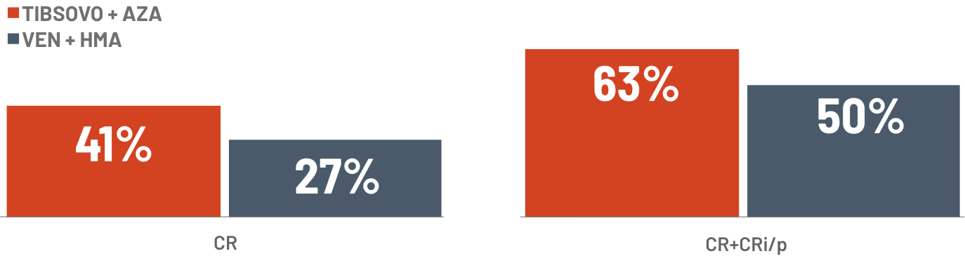 Median time to first bone marrow biopsy was 50 days with TIBSOVO + AZA and 61 days with VEN + HMA; therefore, any earlier responses that may have occurred would not have been recorded