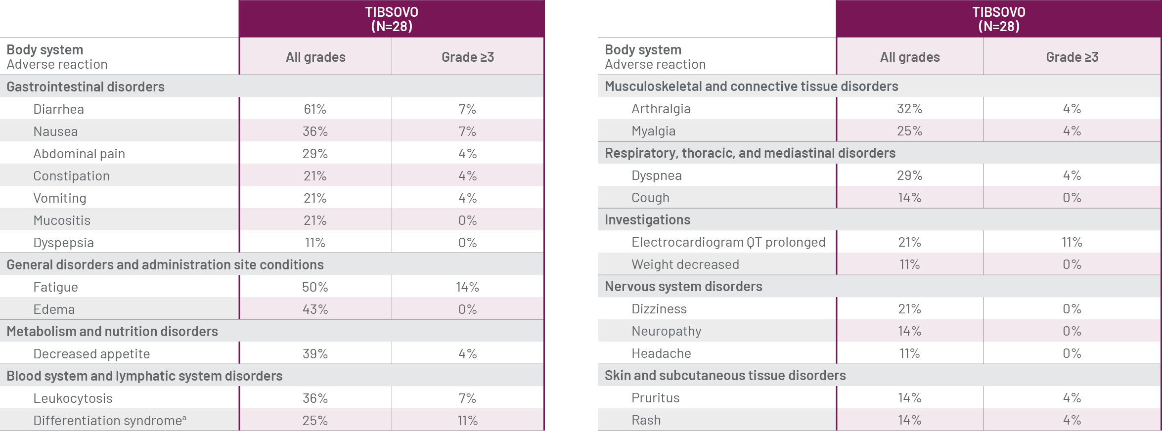 In the monotherapy clinical trial AG120-C-001, 25% (7/28) of patients with newly diagnosed AML and 19% (34/179) of patients with relapsed or refractory AML treated with TIBSOVO experienced differentiation syndrome. Of the 7 patients with newly diagnosed AML who experienced differentiation syndrome, 6 (86%) patients recovered. Of the 34 patients with relapsed or refractory AML who experienced differentiation syndrome, 27 (79%) patients recovered after treatment or after dose interruption of TIBSOVO. Differentiation syndrome occurred as early as 1 day and up to 3 months after TIBSOVO initiation and has been observed with or without concomitant leukocytosis.