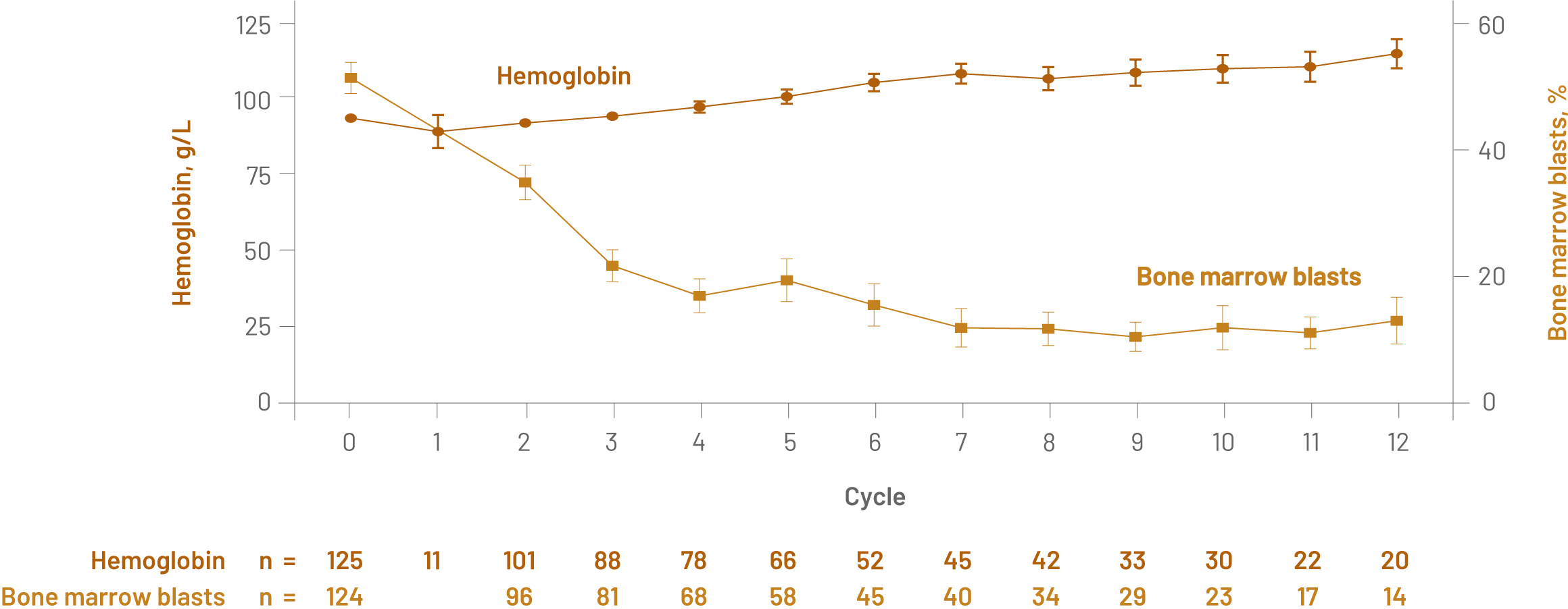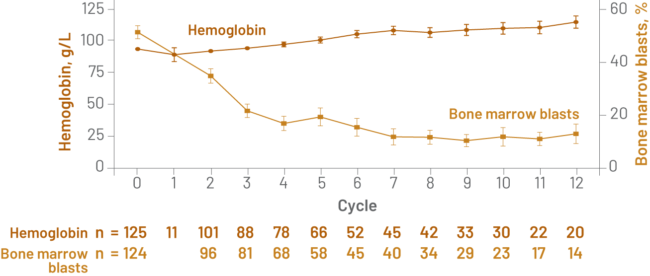 In the combination study AG120-C-009, 15% (11/71) of patients with newly diagnosed AML treated with TIBSOVO plus azacitidine experienced differentiation syndrome. Differentiation syndrome is associated with rapid proliferation and differentiation of myeloid cells and may be life-threatening or fatal. Symptoms of differentiation syndrome in patients treated with TIBSOVO included noninfectious leukocytosis, peripheral edema, pyrexia, dyspnea, pleural effusion, hypotension, hypoxia, pulmonary edema, pneumonitis, pericardial effusion, rash, fluid overload, tumor lysis syndrome, and creatinine increased. Of the 11 patients with newly diagnosed AML who experienced differentiation syndrome with TIBSOVO plus azacitidine, 8 (73%) recovered. Differentiation syndrome occurred as early as 3 days after start of therapy and during the first month on treatment.
