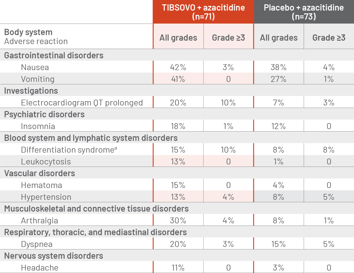 AG120-C-009, 15% (11/71) of patients with newly diagnosed AML treated with TIBSOVO plus azacitidine experienced differentiation syndrome. Differentiation syndrome is associated with rapid proliferation and differentiation of myeloid cells and may be life-threatening or fatal. Symptoms of differentiation syndrome in patients treated with TIBSOVO included noninfectious leukocytosis, peripheral edema, pyrexia, dyspnea, pleural effusion, hypotension, hypoxia, pulmonary edema, pneumonitis, pericardial effusion, rash, fluid overload, tumor lysis syndrome, and creatinine increased. Of the 11 patients with newly diagnosed AML who experienced differentiation syndrome with TIBSOVO plus azacitidine, 8 (73%) recovered. Differentiation syndrome occurred as early as 3 days after start of therapy and during the first month on treatment.