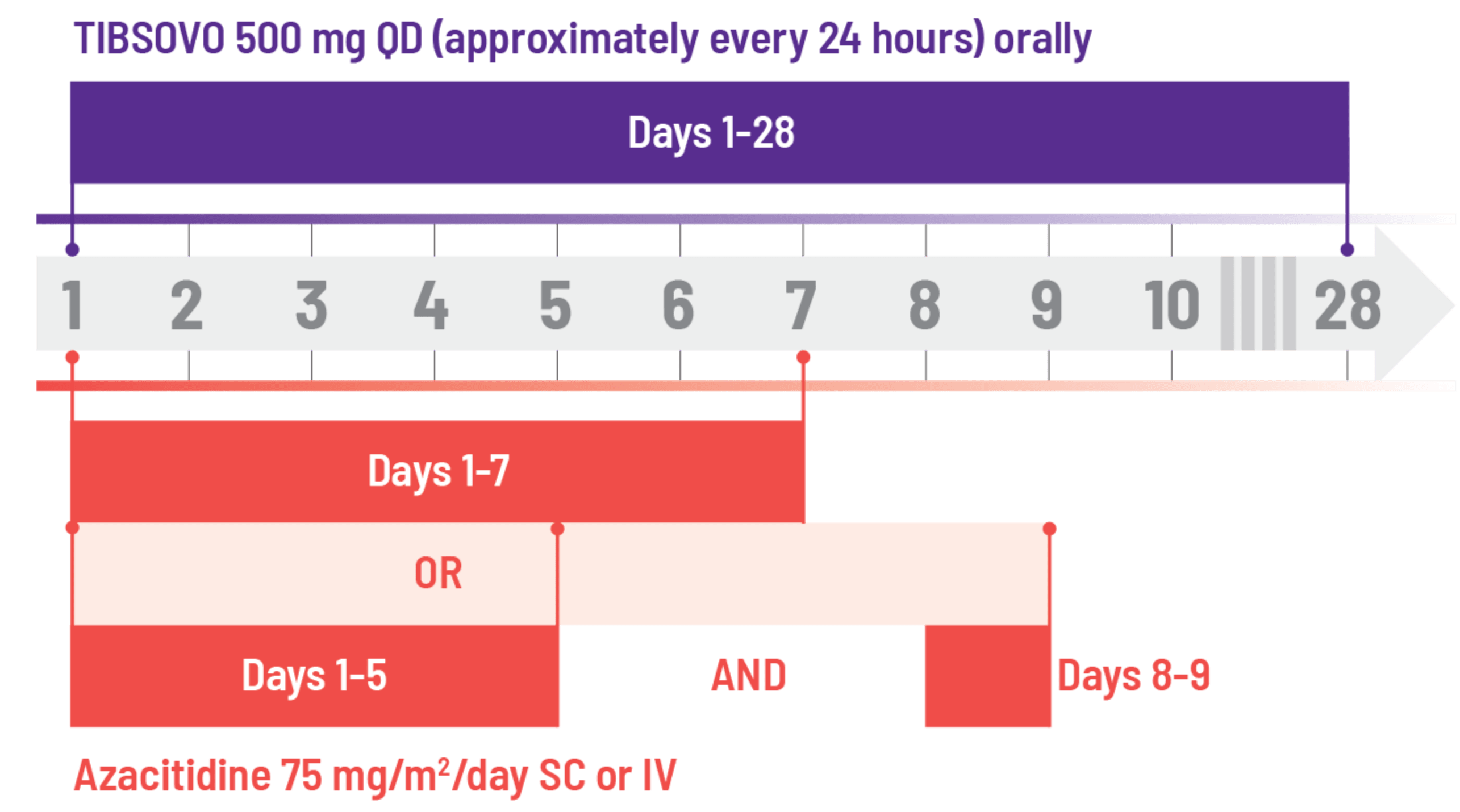 AG120-C-009, 15% (11/71) of patients with newly diagnosed AML treated with TIBSOVO plus azacitidine experienced differentiation syndrome. Differentiation syndrome is associated with rapid proliferation and differentiation of myeloid cells and may be life-threatening or fatal. Symptoms of differentiation syndrome in patients treated with TIBSOVO included noninfectious leukocytosis, peripheral edema, pyrexia, dyspnea, pleural effusion, hypotension, hypoxia, pulmonary edema, pneumonitis, pericardial effusion, rash, fluid overload, tumor lysis syndrome, and creatinine increased. Of the 11 patients with newly diagnosed AML who experienced differentiation syndrome with TIBSOVO plus azacitidine, 8 (73%) recovered. Differentiation syndrome occurred as early as 3 days after start of therapy and during the first month on treatment.