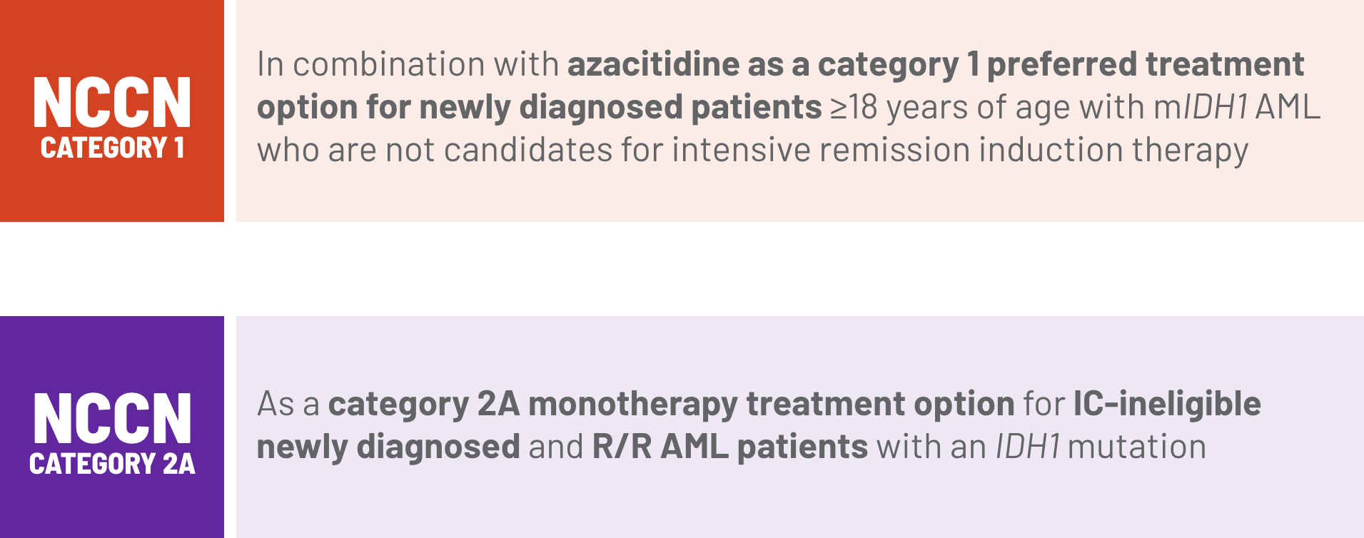 IC, induction chemotherapy; IDH1, isocitrate dehydrogenase-1; mIDH1, mutated IDH1; NCCN, National Comprehensive Cancer Network® (NCCN®); R/R, relapsed or refractory.