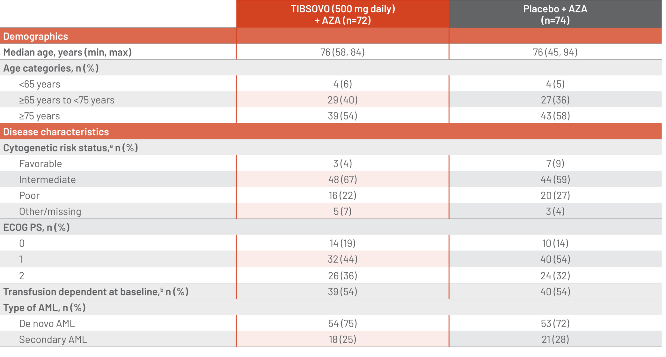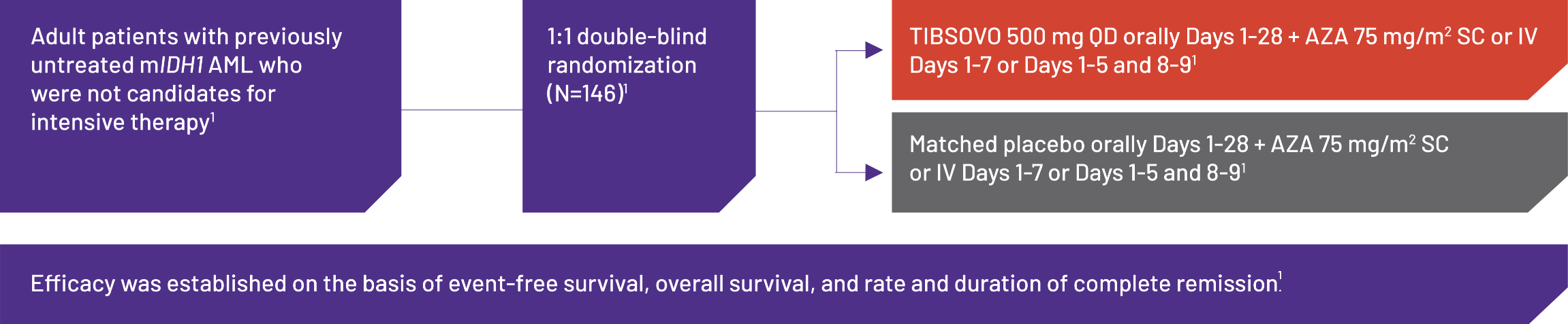 TIBSOVO + AZA was studied in a global, phase 3, multicenter, randomized, double-blind, placebo-controlled trial1,4
