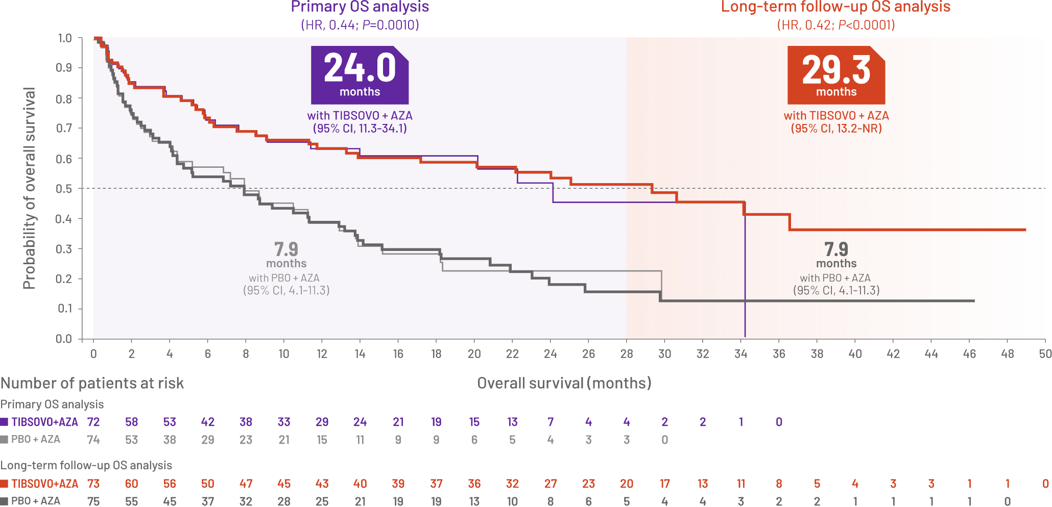 bIn the long-term follow-up analysis from the AGILE study, 148 patients were 1:1 randomized: 73 to TIBSOVO + AZA and 75 to PBO + AZA.2 The data cutoff was June 2022 with a median follow-up of 28.6 months for the OS analysis.