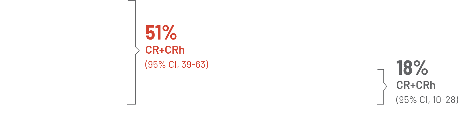 aCR was defined as <5% blasts in the bone marrow and no Auer rods, absence of extramedullary disease, full recovery of peripheral blood counts (absolute neutrophil count ≥1000/μL and platelets ≥100,000/μL), and independence from red blood cell transfusions.5 CRh was defined as <5% blasts in the bone marrow and no Auer rods, absence of extramedullary disease, and partial recovery of peripheral blood counts (absolute neutrophil count >500/μL and platelets >50,000/μL).