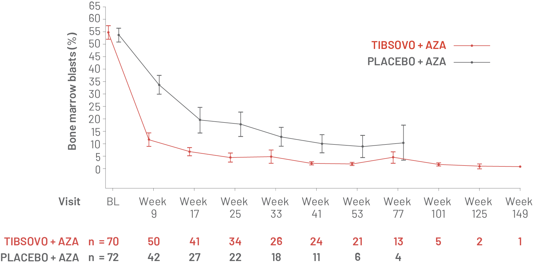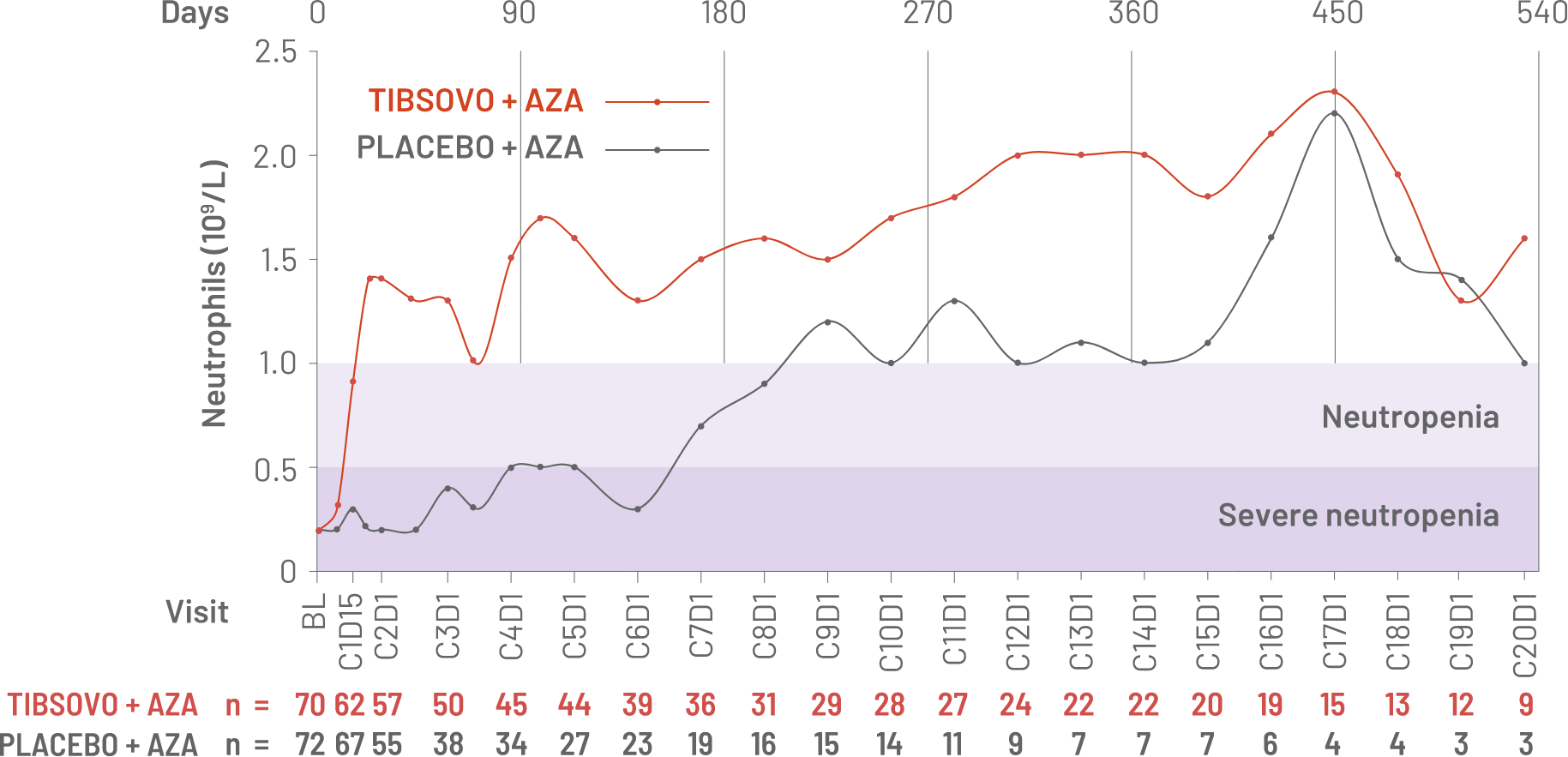 aBL denotes baseline, defined as a median ANC value of 0.2 x 109/L for the TIBSOVO + AZA arm and placebo + AZA arm; CxDy indicates Cycle x Day y.6