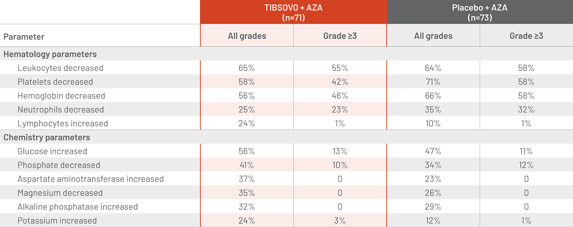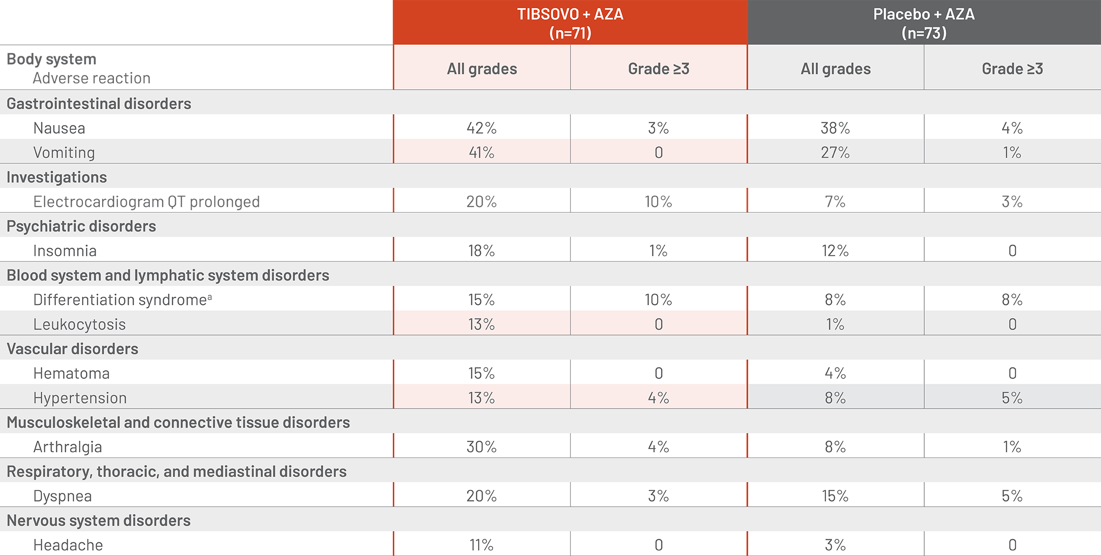 Differentiation syndrome is associated with rapid proliferation and differentiation of myeloid cells and may be life-threatening or fatal. Symptoms of differentiation syndrome in patients treated with TIBSOVO included noninfectious leukocytosis, peripheral edema, pyrexia, dyspnea, pleural effusion, hypotension, hypoxia, pulmonary edema, pneumonitis, pericardial effusion, rash, fluid overload, tumor lysis syndrome and creatinine increased.