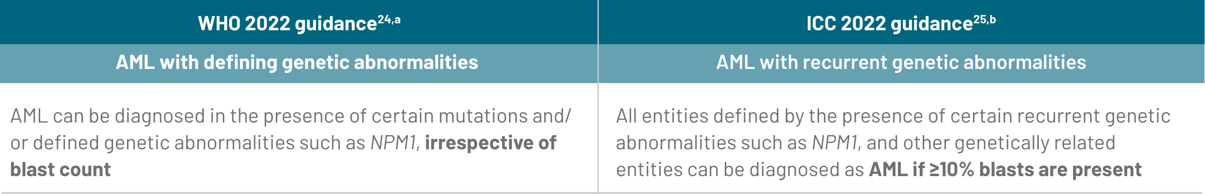 ICC, International Consensus Classification; IDH1, isocitrate dehydrogenase-1; NPM1, nucleolar phosphoprotein B23; WHO, World Health Organization.