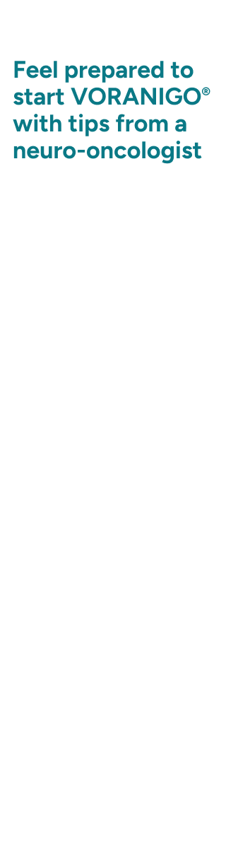 VORANIGO (40 mg tablets) is a prescription medicine used to treat adults and children 12 years of age and older with certain types of brain tumors called astrocytoma or oligodendroglioma with an isocitrate dehydrogenase-1 (IDH1) or isocitrate dehydrogenase-2 (IDH2) mutation, following surgery. Your healthcare provider will perform a test to make sure that VORANIGO is right for you. It is not known if VORANIGO is safe and effective in children under 12 years of age.